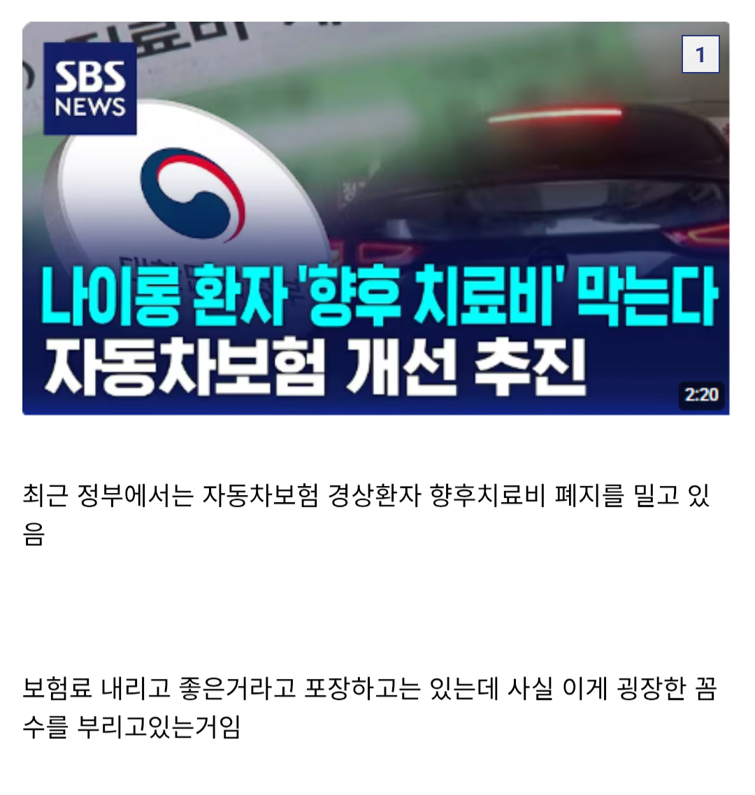 핵심 내용은 경미한 사고(경상 환자)의 경우, 합의금 산정 시 '향후치료비' 항목을 없애겠다는 것입니다.